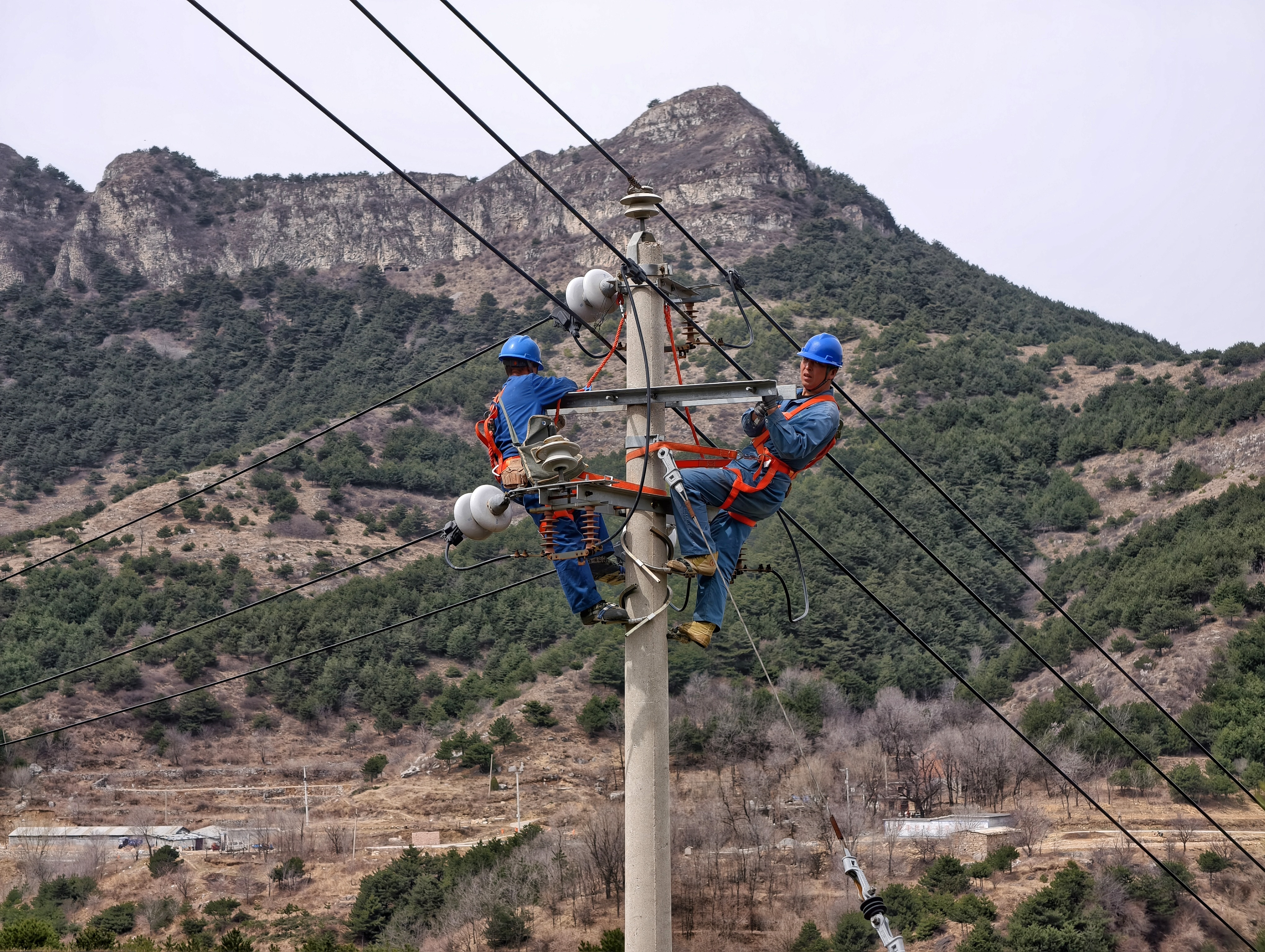 3月26日,國網(wǎng)長治平順縣供電公司員工在10千伏玉峽關(guān)線開展防火雙橫擔改造春檢作業(yè)。郭海波 攝
